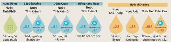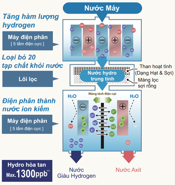 | Điện phân (Công tắc khả năng điện phân) | 3 mức độ ion kiềm / giàu hydrogen + 1 mức độ nước hydro kiềm mạnh + 1 mức độ nước axit + 1 mức độ nước khử trùng |