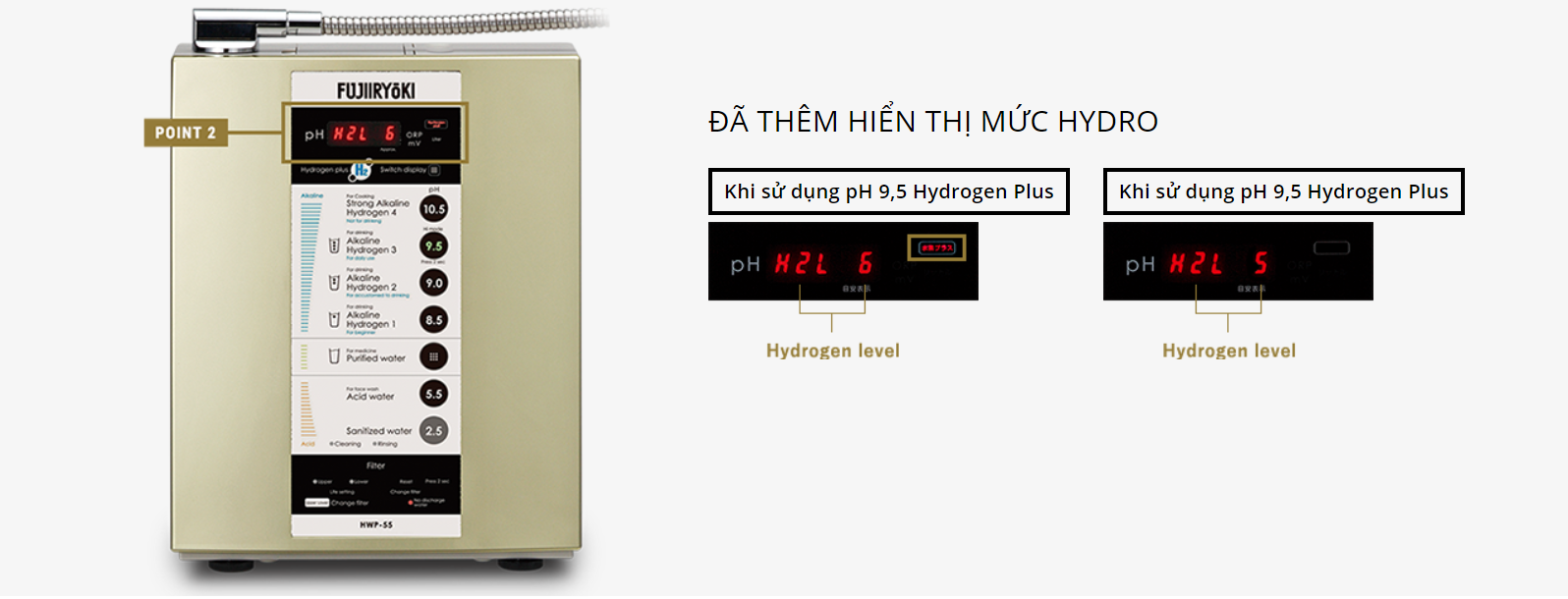 Máy lọc nước FUJIIRYOKI HWP 55 tạo được ra 10 loại nước đáp ứng nhu cầu khác nhau của người tiêu dùng: