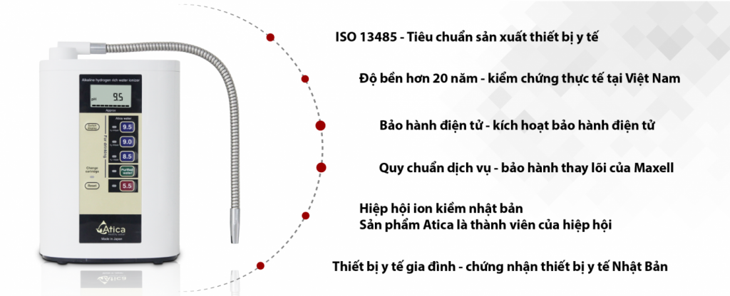 Có thể thấy rằng máy lọc nước ion kiềm Atica được tạo ra bởi Nhật Bản không chỉ tạo được loại nước ion kiềm mà còn giàu hydro có hoạt tính hòa tan và cực kỳ tốt cho sức khỏe, tăng cường được lượng magie và canxi giúp xương chắc khỏe và cơ thể cũng dễ dàng hấp thụ các chất dinh dưỡng hơn so với các loại máy lọc nước ion kiềm khác trên thị trường. Ngoài ra, Atica còn là dòng máy tạo nước ion kiềm duy nhất hiện nay được phép sử dụng tên gọi Alkaline hydrogen rich water ionizer trên thế giới(máy tạo nước ion kiềm giàu hydro) do những đột phá công nghệ làm giàu hydro của Maxell: