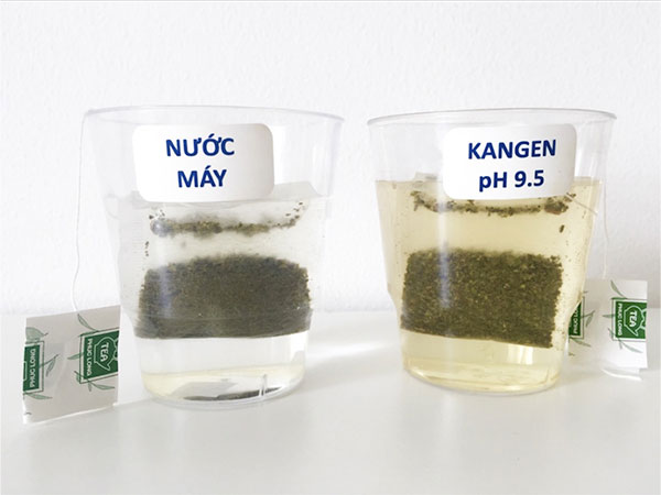 Thí nghiệm pha trà ở nhiệt độ thường với nước máy và nước kangen (bên nước kangen màu vàng đậm hơn nhiều)
